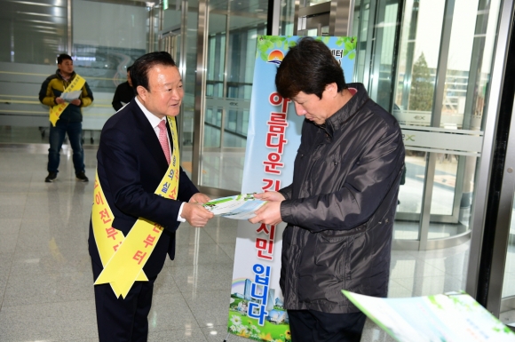 | 이날 박보생 김천시장을 비롯한 직원들은 홍보 어깨띠를 두르고 일일이 전단지를 기관 직원들에게 돌리며 주소 이전을 홍보하고 시정 발전을 위해 ‘15만 인구회복’의 필요성을 호소하였다.
