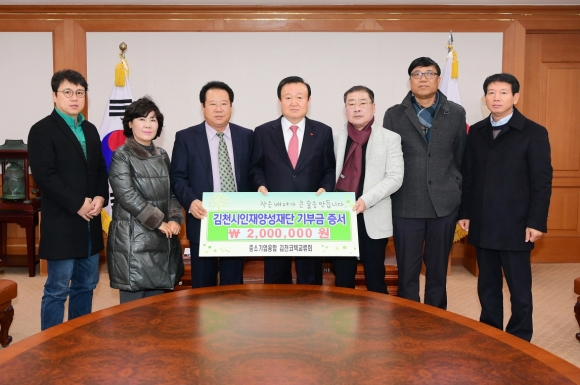 | 김천의 교육발전과 글로벌 인재육성을 위해 (사)중소기업융합 대구경북연합회 김천코텍교류회(회장 이건우)에서 김천시인재양성재단(이사장 박보생)에 장학기금 이백만원을 기탁했다.