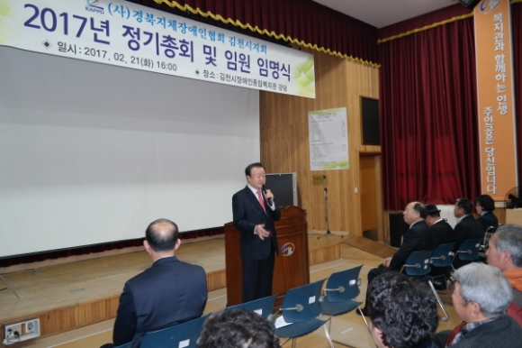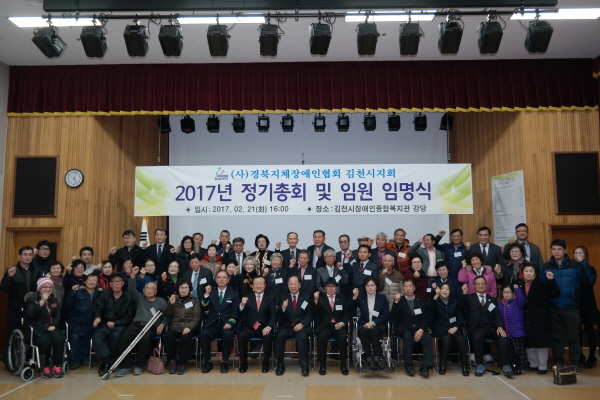 |  | | | ⓒ 김천내일신문 | | (사)경북지체장애인협회김천시지회(지회장 박선하)는 지난2월 21일 장애인종합복지관 3층 강당에서 박보생 김천시장, 후원회 회장인 김정호 김천상공회의소 회장, 대도중공업(주) 백계자 대표, KTX김천(구미)역 이용언 부역장, 박선하 지회장을 비롯한 대의원, 직원 등 80여명이 참석한 가운데 “2017년 정기총회 및 임원 임명식”을 개최하였다.
