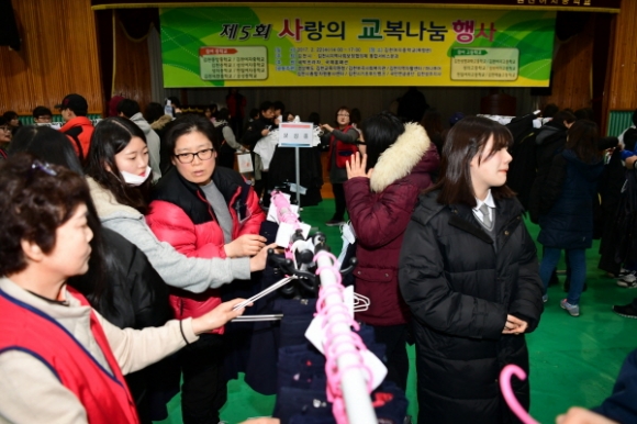 「제5회 사랑의 교복 나눔 행사」는 김천시와 김천시지역사회보장협의체 통합서비스분과에서 주최하고 김천교육지원청 등 7개 기관 공동주관으로 김천시 관내 14개 중·고등학교가 참여를 하였으며, 졸업생들이 입던 교복과 체육복을 기증받아 깨끗하게 세탁을 하여, 1점당 1천원에서 5천원의 저렴한 가격으로 판매하였다.