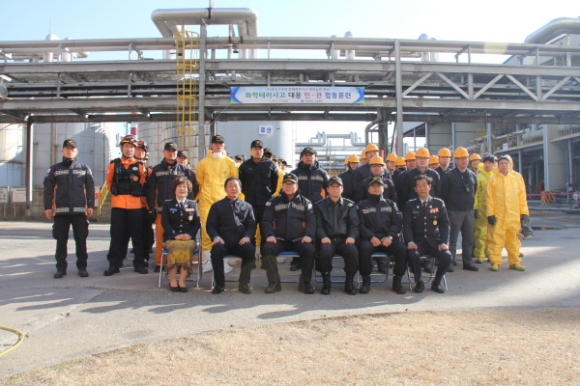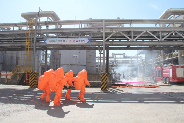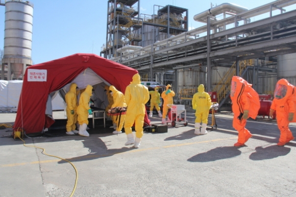 훈련은 공장 내 자위소방대 역할 분담에 따라 인명대피유도, 초기대응훈련을 반복 숙지하고 첨단장비를 활용한 오염도 측정, 오염지역 진입 인명구조, 환자이송, 주민대피유도, 누출차단, 장비·인체제독, 중화, 확산방지를 위한 훈련 순으로 진행됐다.