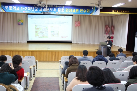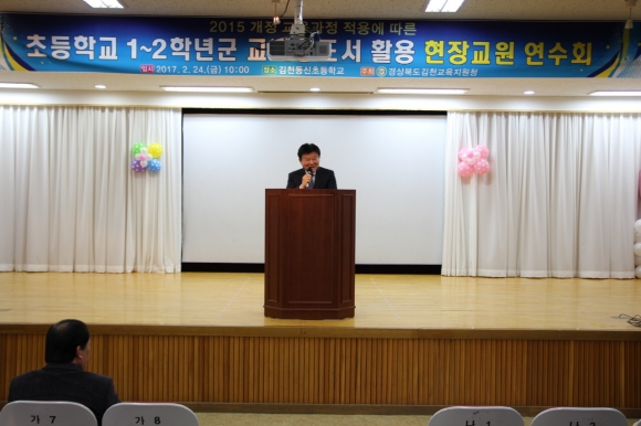 | 경상북도김천교육지원청(교육장 장태덕)은 2월 24일(금) 김천동신초등학교 1층 시청각실에서 관내 초등학교 연구교사 및 1·2학년 담임교사 120명을 대상으로 ‘초등학교 1~2학년군 교과용 도서 활용 현장교원 연수회’를 실시하였다.