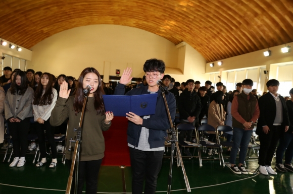신입생 대표 김도완(간호학과)군과 김경리(간호학과)양은 입학선서를 통해 "학칙을 준수하고 교훈인 근면, 성실, 정직의 정신을 바탕으로 인격을 도야하며 학문연구를 본분으로 삼아 자랑스러운 학생이 되겠다."고 선서했다.