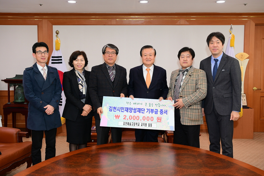| 김천의 교육발전과 글로벌 인재육성을 위해 김천예술고등학교(교장 주광석)교직원 일동이 김천시인재양성재단(이사장 박보생)에 장학기금 이백만원을 기탁했다.