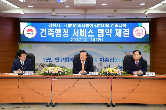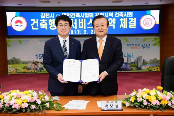 | 김천시(시장 박보생)에서는 건축행정의 시민만족 극대화를 위해 시민과 함께하는 건축행정 서비스를 위하여 김천지역건축사회와 협약을 체결했다고 밝혔다.