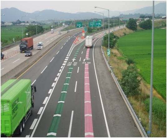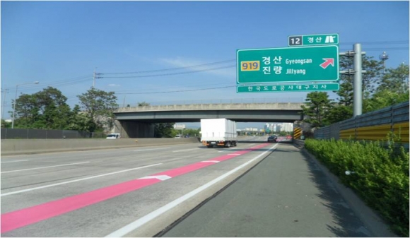 | ‘컬러 차로유도선’은 분기점, 나들목 등과 같은 갈림길에서 특정방향의 경로를 미리 알려주기 위해 설치된 선명한 색상의 유도선이다. 운전자들은 진출경로를 미리 확인하고 대비할 수 있게 된다.