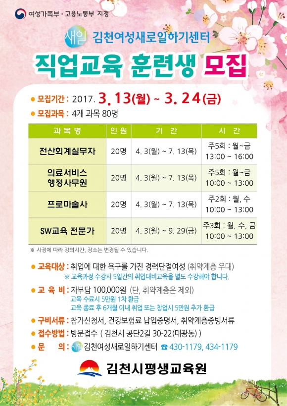 김천시에서 운영하는 여성새로일하기센터(센터장:김금숙)는 3월 13일(월)부터 3월 24일(금)까지 여성가족부 지원 직업교육훈련생을 모집한다.