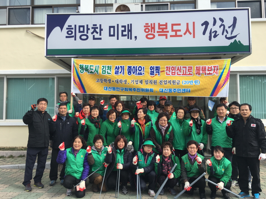| 김천시 대신동 새마을협의회(회장 이군호, 부녀회장 이영숙)은 회원 50명, 통장, 공무원과 함께 지난 8일 새봄을 맞이하여 환경정화 활동 하였다.