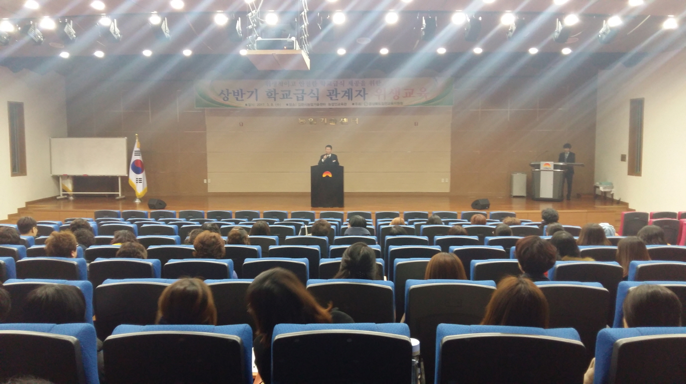 경상북도김천교육지원청(교육장 장태덕)은 학교급식 관계자의 위생 관념 고취 및 자질 함양과 직무 능력 향상을 통한 위생적이고 안전하며 맛있는 학교급식 제공을 위하여 2017년 3월 8일(수) 김천시농업기술센터 농업인교육관에서 공립단설유치원, 초․중․고등학교 영양교사, 영양사, 조리사, 조리원, 식재료 납품업체 관계자 등 280여 명을 대상으로 “2017 상반기 학교급식 관계자 위생교육”를 개최하였다.