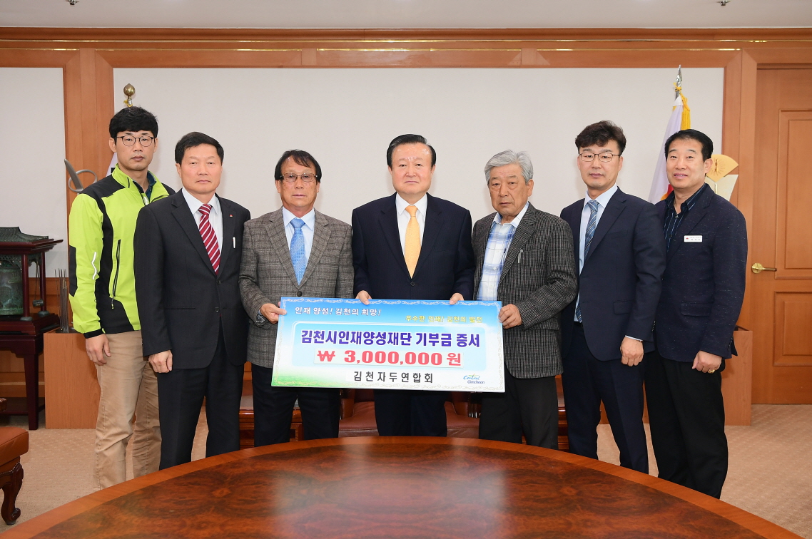 지난 14일 2층 접견실에서 김천자두연합회 양정규 회장 및 임원진들은 “지역의 우수한 인재육성과 교육발전에 적극 동참하자는 회원들의 마음을 모아 김천시인재양성재단에 삼백만원을 기탁하게 됐다”고 말했다.