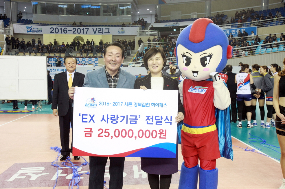 | ‘EX 사랑기금’은 한국도로공사가 이웃사랑을 위하여 V리그 2016~2017 시즌 ‘김천 하이패스 배구단’ 경기결과에 따라 적립한 기금으로, 직원들의 자발적 참여로 마련되었다. 배구 1경기 승리 시마다 100만원, 서브․블로킹․후위공격 득점 시 각 3만원 등 총 2,500만원이 적립되었다.