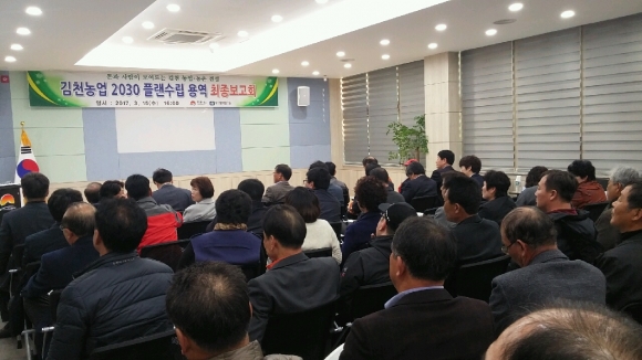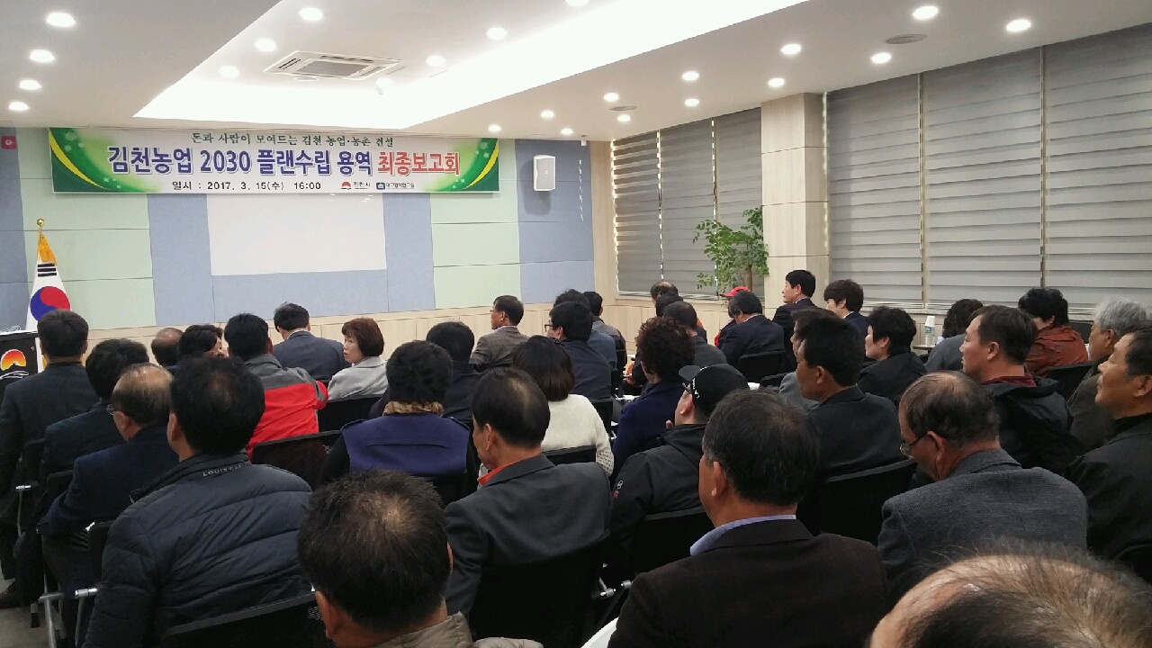 | 김천시(시장 박보생)는 급변하는 농업여건변화에 선제적으로 대응하고 또다른 50년-100년을 준비하고 설계하기 위해 김천농업 2030플랜수립의 최종보고회를 2017.3.15.일 농업기술센터 회의실에서 가졌다.