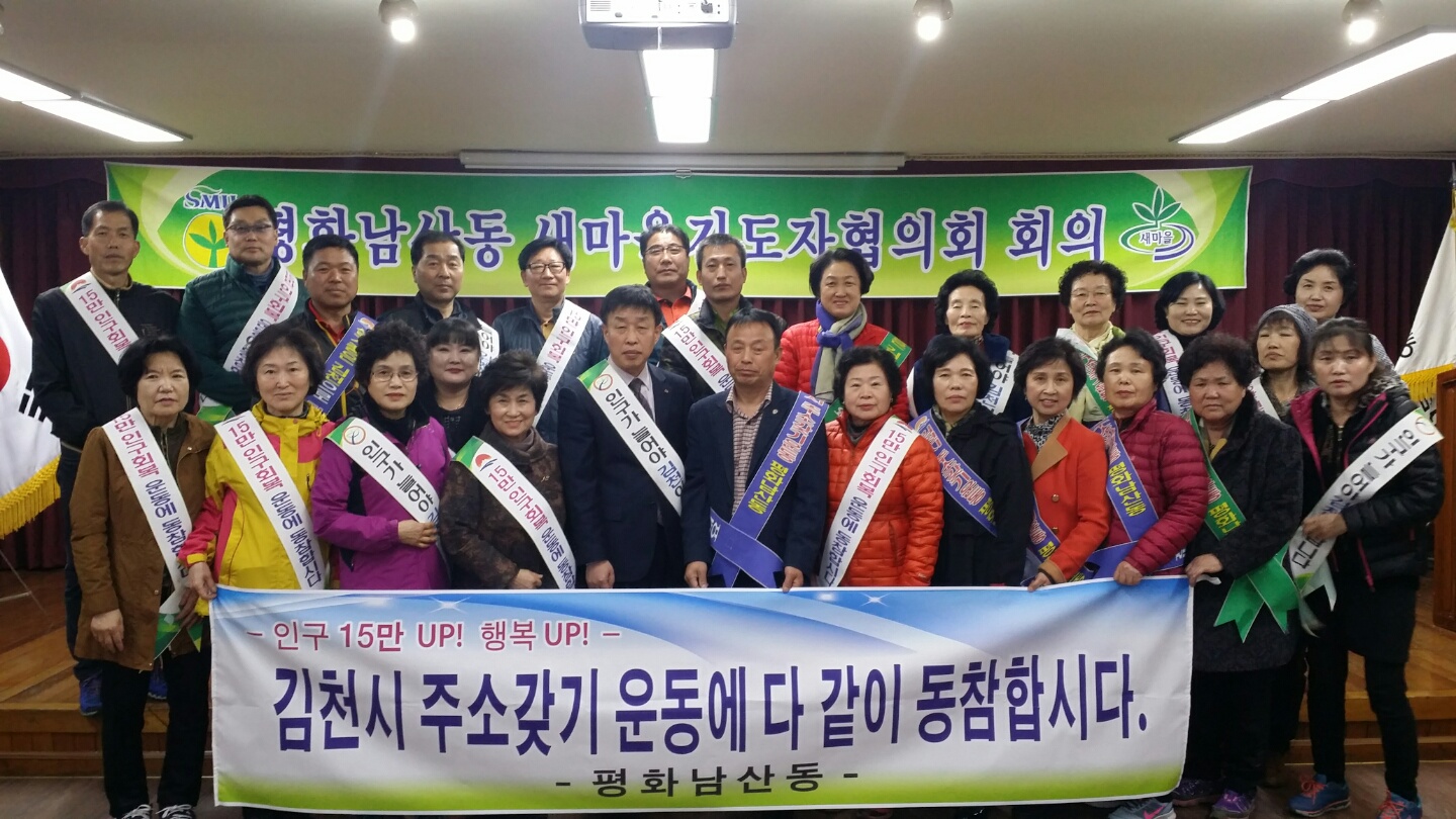 평화남산동 새마을지도자협의회(협의회장 이창도. 부녀회장 빈봉춘)는 2017년 3월20일 회원 40여명이 참여한 가운데 조직의 활성화와 회원 상호간의 친목 도모 등 올해 사업추진을 위한 열띤 토론과 이웃사랑실천을 위한 다짐의 시간과 함께 김천사랑 범시민 15만 인구회복을 위한 결의대회를 가졌다.