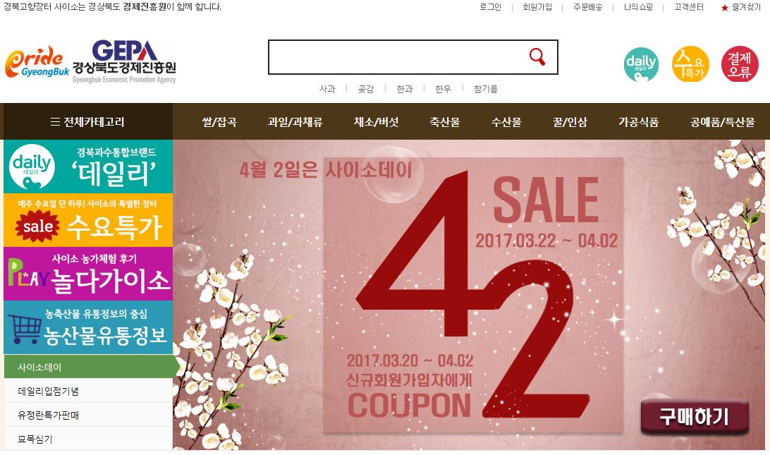 | 경상북도는 4.2일 사이소데이를 맞아 경북농특산물 쇼핑몰 ‘사이소(www.cyso.co.kr)’를 통해 지역 우수농특산물 특별 할인판매를 실시한다고 밝혔다.