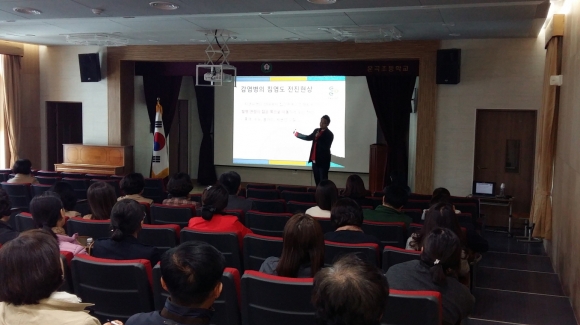 | 경상북도김천교육지원청(교육장 장태덕)은 감염병에 대한 선제적 예방과 학교 내 감염병 유입 시 안정적이고 체계적인 대응을 통해 학생 및 교직원의 건강을 보호하기 위하여 2017년 3월 22일(수) 운곡초등학교 시청각실에서 초․중․고등학교 교감, 보건업무 담당자 등 110여 명을 대상으로 “2017학년도 교감 및 보건(담당)교사 대상 감염병 예방관리 교육”을 개최하였다.
