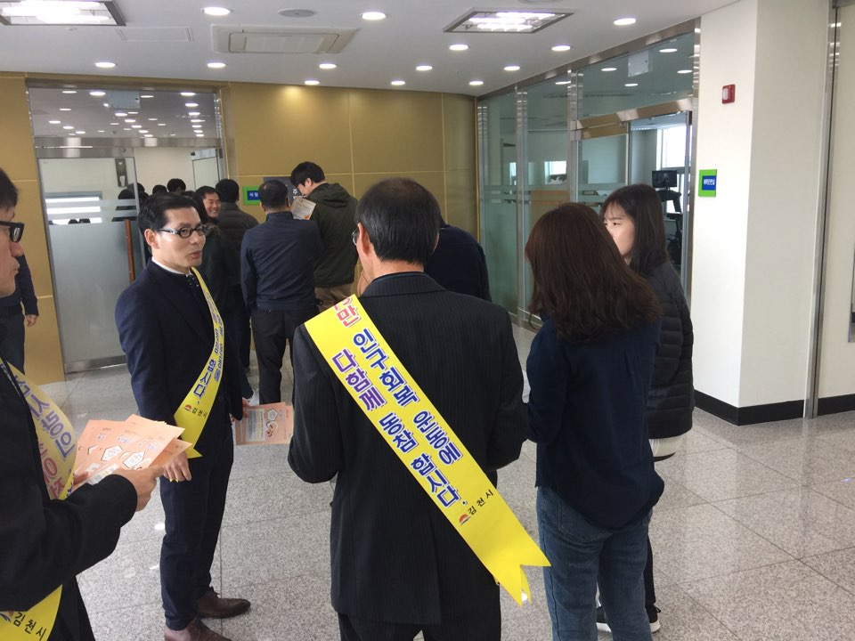 | 이날 홍보캠페인에는 전인진 농업기술센터소장, 강성호 농축산과장 등 직원 20여명이 주소전입신고서를 준비하여 현장에서 실시하였으며 현수막, 어깨띠, 홍보전단을 나눠주며 15만 인구회복은 김천시민과 후손의 미래가 달려 있는 시급한 과제라는 것에 인식을 같이 하고 혁신도시 이전 농업관련 기관의 임직원을 대상으로 김천가족만들기에 결의를 다져 가시적인 성과가 나타날것으로 전망되고 있다. |