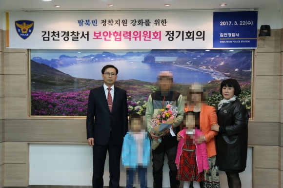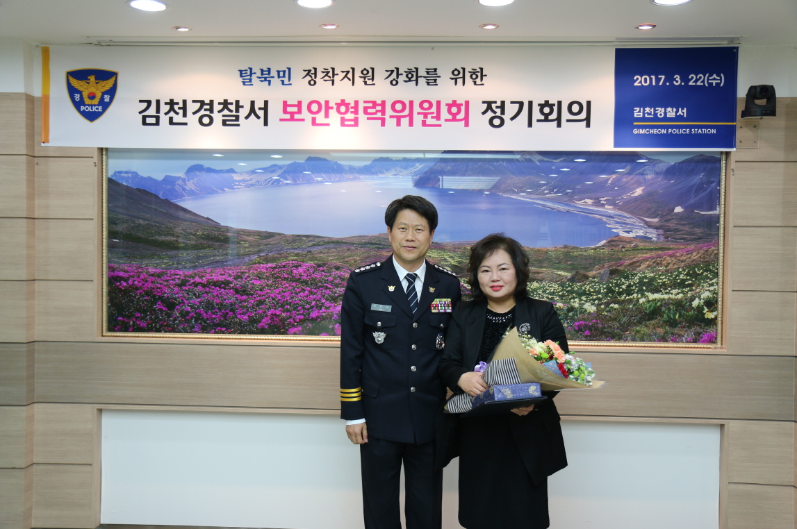 | 이 자리에서 이희해(여, 김천요리학원 대표) 위원에 대하여 탈북민 정착지원 유공으로 경찰서장 감사장과 지난해 도심에서 살다가 귀농하여 어렵게 살아가는 탈북민 S에 자녀 장학금(30만)을 전달하고 안보 영상물을 시청, 지난 1/4분기 보안협력위원회 활동사항, 2017년 탈북민 지원 방안 논의, 자체회의 순으로 진행되었다. |