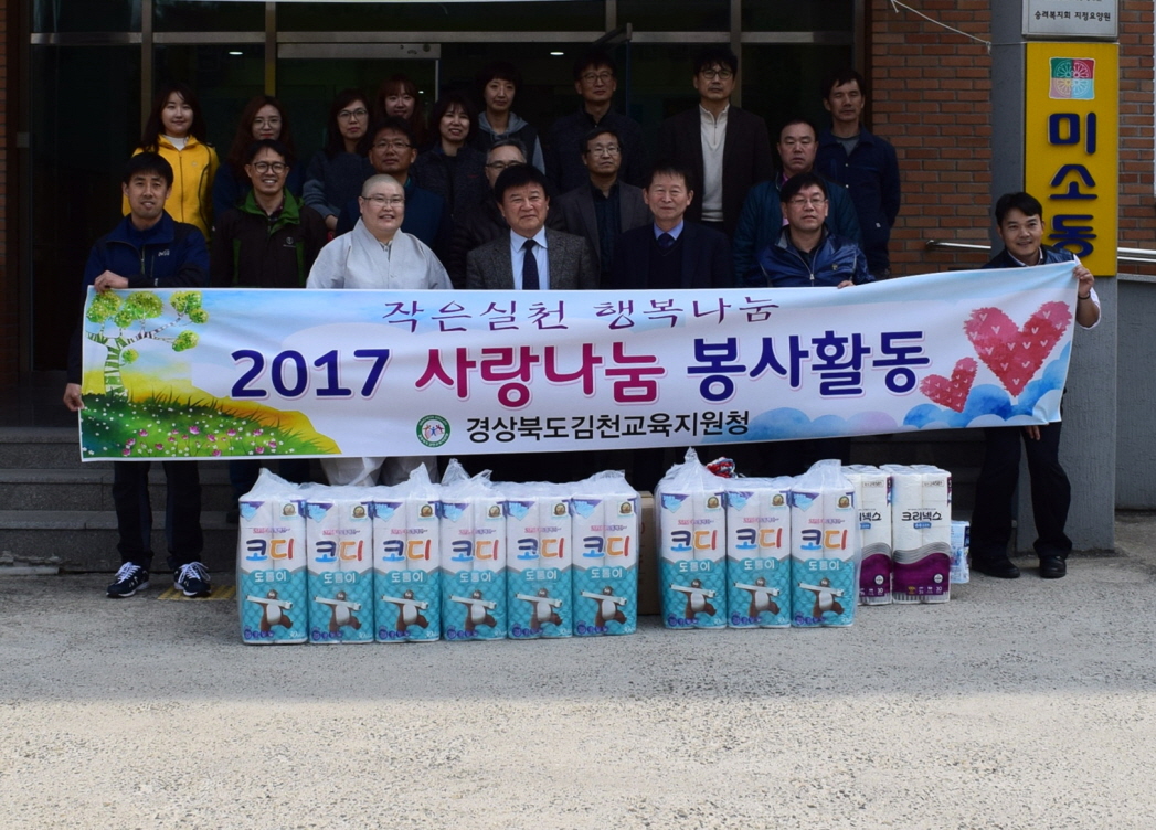 | 김천교육지원청(교육장 장태덕)은 2017. 3. 23.(목) 김천시 대항면 소재의 노인 전문 요양시설 직지사노인요양원을 방문해 봉사활동을 실시하였다.