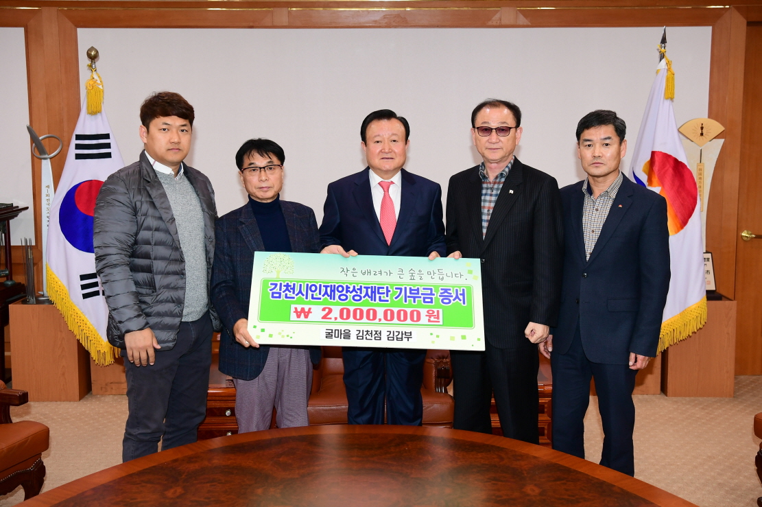 | 김천의 교육발전과 글로벌 인재육성을 위해 김천시 굴마을 김천점 김갑부 대표가 김천시인재양성재단(이사장 박보생)에 장학기금 이백만원을 기탁했다.