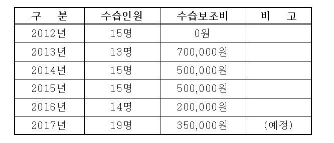 공단은 2012년부터 현재까지 매년 15명 내외의 수습변호사에게 실무수습을 실시하고 있으며 실무수습 보조비 지급 현황은 아래와 같다.