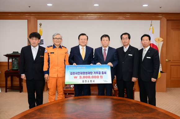 | 김천의 교육발전과 글로벌 인재육성을 위해 김천소방서(서장 백남명)에서 김천시인재양성재단(이사장 박보생)에 장학기금 삼백만원을 기탁했다.