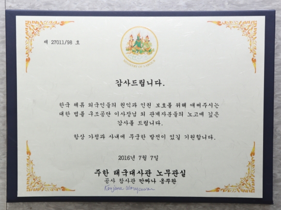 국내거주외국인 근로자들의 경우 소송 등에 많은 장애가 있다. 태국의 경우 대사관이 나서서 이런 부분들을 직접 지원하고 있다. 주한 태국 대사관과 공단의 지역 관할 사무소는 태국 근로자들의 권리구제를 위해 긴밀히 협력하면서 체불임금 사건을 처리해 왔는데 작년 7월 태국대사관은 감사의 서신을 보내왔다.