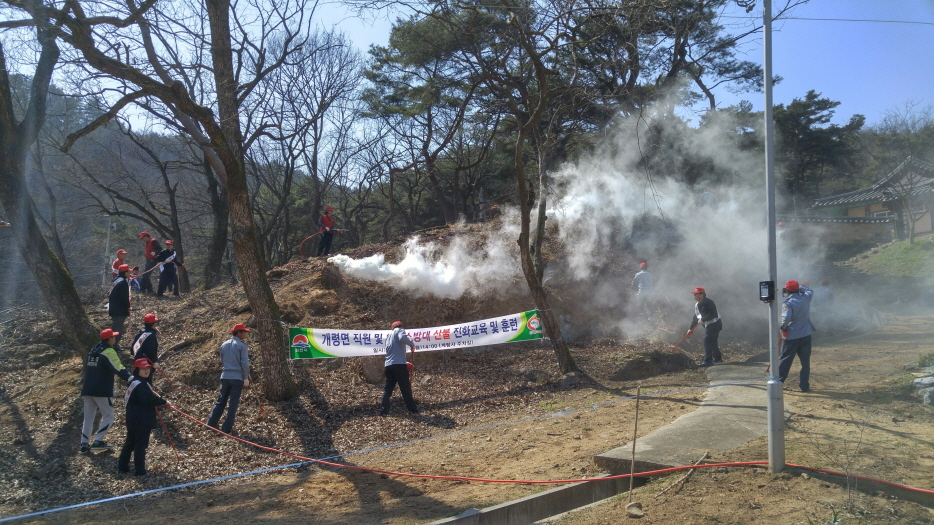 이번 훈련에는 대광119치안센터에서 진화용 소방차1대, 소화기 2대 등 소방장비와 개령면사무소에서 산불진화용 차량 1대와 등짐펌프 20개, 갈퀴, 삽 등 진화장비를 동원하였고 현장에서 연막탄을 터트린 가운데 실제 산불을 가상하여 모의훈련을 실시함으로서 완벽한 대응체계를 갖추었다.