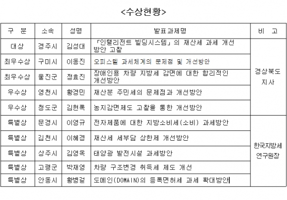 특히, 이번 발표대회는 지방세 전문 연구기관인 한국지방세연구원과 경북도가 대회를 공동으로 개최하고, 상생협력 파트너인 대구시도 참여하는 등 행사의 수준을 높이는 노력도 돋보였다.