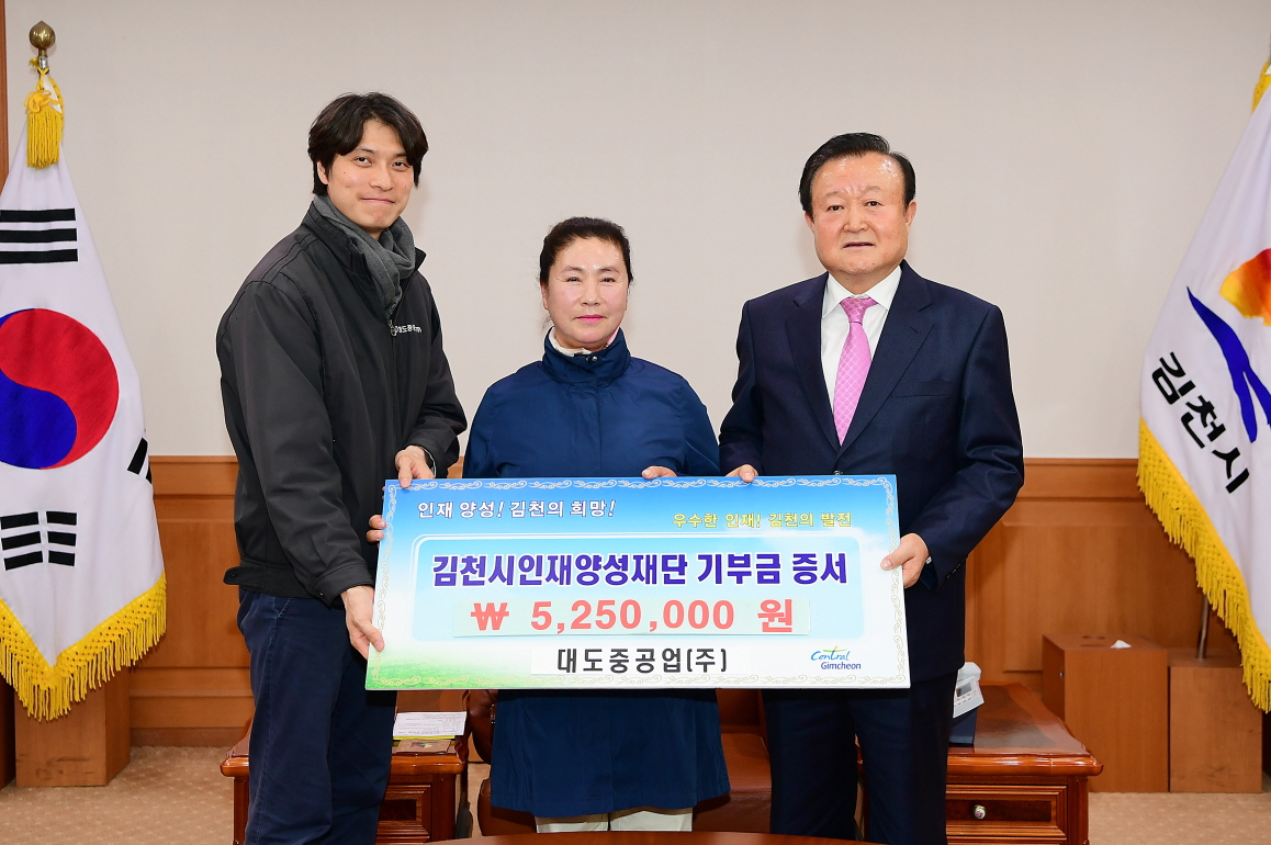 | 김천의 교육발전과 글로벌 인재육성을 위해 대도중공업(주)(대표 백계자, 장락기)에서 김천시인재양성재단(이사장 박보생)에 장학기금 오백이십오만원을 기탁했다.