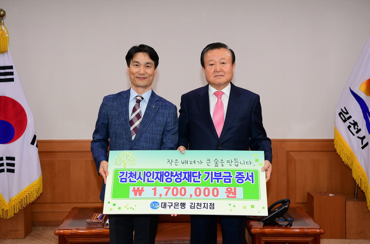 | 김천의 교육발전과 글로벌 인재육성을 위해 대구은행 김천지점(지점장 박영효)에서 김천시인재양성재단(이사장 박보생)에 장학기금 일백칠십만원을 기탁했다.