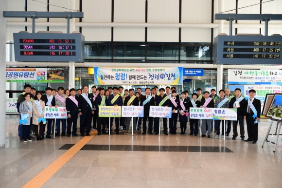 김천시는 12일 혁신도시 김천구미역사 내에서 김천시, 혁신도시 12개 이전 공공기관, 한국철도 김천구미역 직원과 합동으로 청렴문화 조성을 위한 청렴 캠페인을 실시했다.