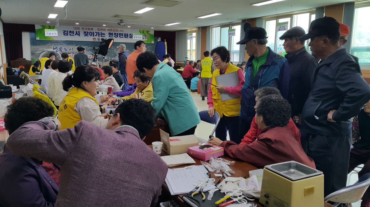 | 금번 현장민원실에는 김천시자원봉사센터의 자원봉사자 70여명과 공공기관 직원 및 공무원 10여명이 참여하여 행사를 성공적으로 이끌었으며 민원해결 5건, 순회봉사 50건, 각종이동전문봉사 487건을 제공하였다.
