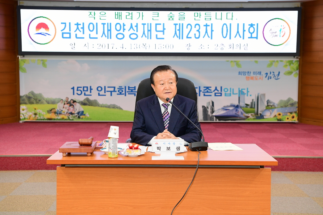 | 김천시인재양성재단(이사장 박보생)에서는 지난 13일(목) 시청 2층 회의실에서 재단 이사 및 감사가 참석한 가운데 2017년도 김천시인재양성재단 장학생 선발․심의를 위한 제23차 이사회를 개최하였다.