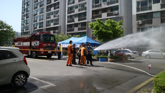 | 김천경찰서(서장 김영수)는, 4월 19일 김천시 황금동 소재 한신아파트 단지 내에서 화재발생 시 대응 역량 강화를 위한 재난 대응 훈련을 실시하였다.