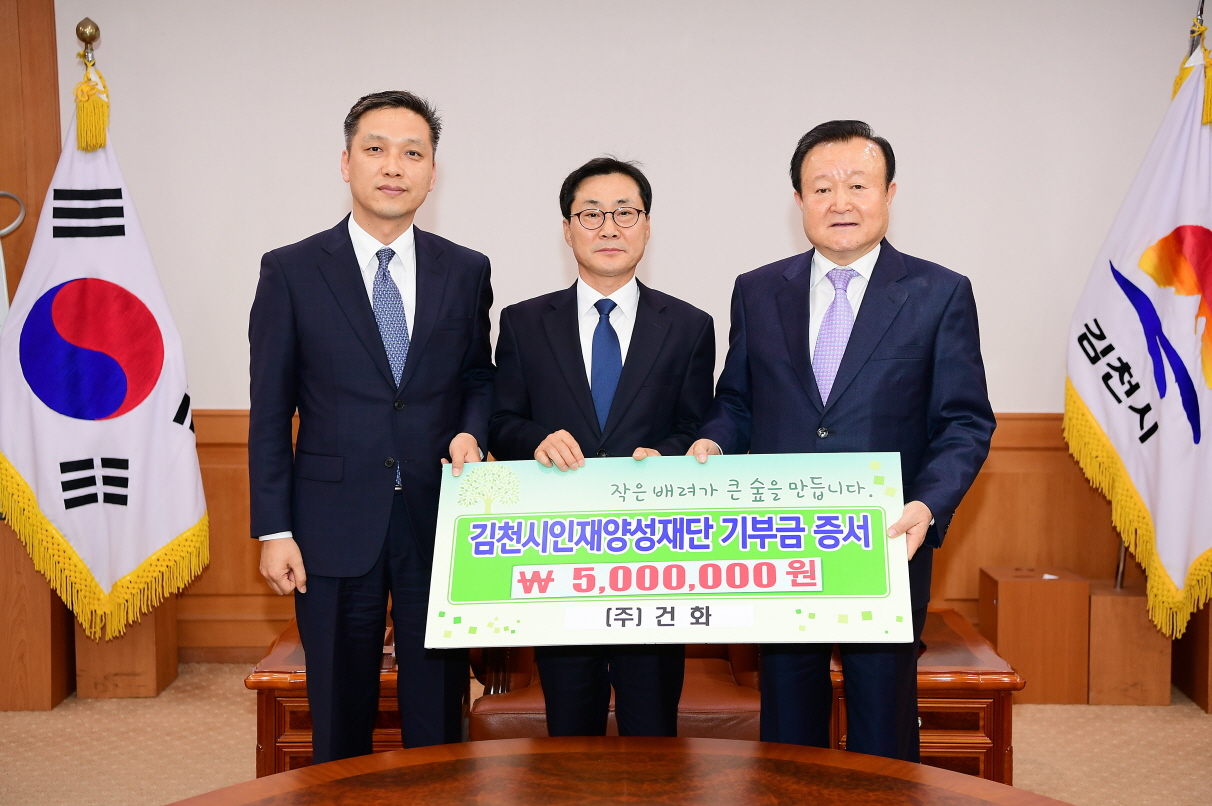 | 김천의 교육발전과 글로벌 인재육성을 위해 (주)건화(대표 최진상)에서 김천시인재양성재단(이사장 박보생)에 장학기금 오백만원을 기탁했다.