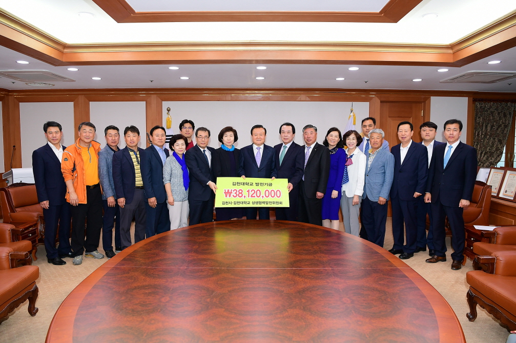지난 3월 13일 구성된 김천시·김천대학교간 상생협력발전위원회의 김용환 위원장, 최동원‧이동희 부위원장, 이순기 사무국장, 손희동 총무를 비롯한 임원진은 이날 기탁식에서 “김천대학교가 빠른 시일 내에 경쟁력을 제고하여 지역의 중심 대학으로 성장해 나갈 수 있도록 발전기금 확충 등 발전방안에 대해 지속적으로 모색하고 있으며, 현재까지 상생협력발전위원회 위원들이 십시일반으로 모은 삼천팔백일십이만원을 김천대학교 발전기금으로 기탁하게 되었다“고 말했다.
