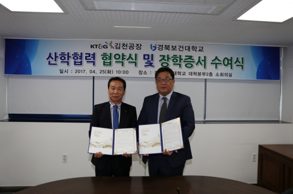 | 경북보건대학교(총장 이은직)와 KT&G 김천공장 간 산학협력 협약식 및 우수학생 장학증서 수여식이 25일, 개최되었다.