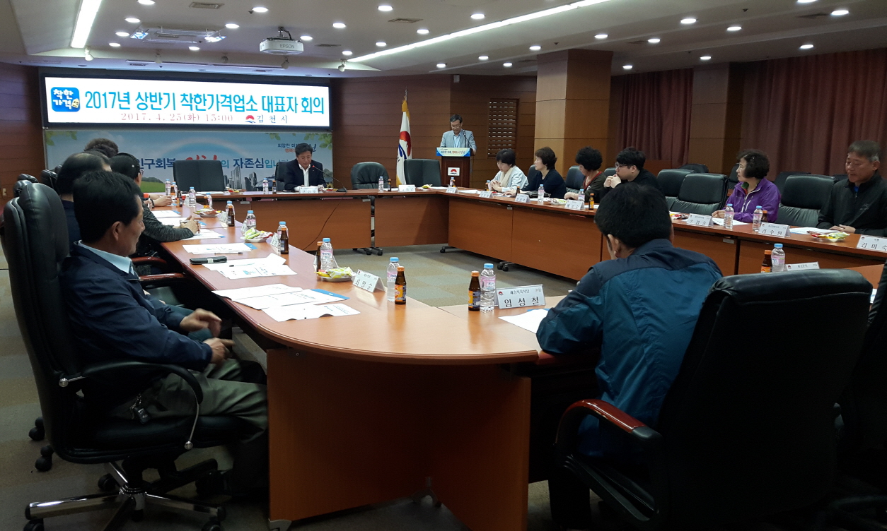 | 김천시(시장 박보생)는 지난 25일 오후 3시 시청 2층 회의실에서 착한가격업소대표 22명이 참석한 가운데 대표자회의를 개최하였다.