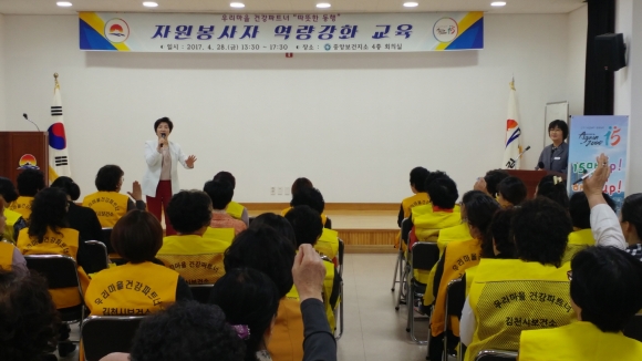 | 김천시(시장 박보생)는 지난 28일 중앙보건지소 4층 회의실에서 ‘우리마을 건강파트너 자원봉사자 역량강화 교육’을 실시했다.