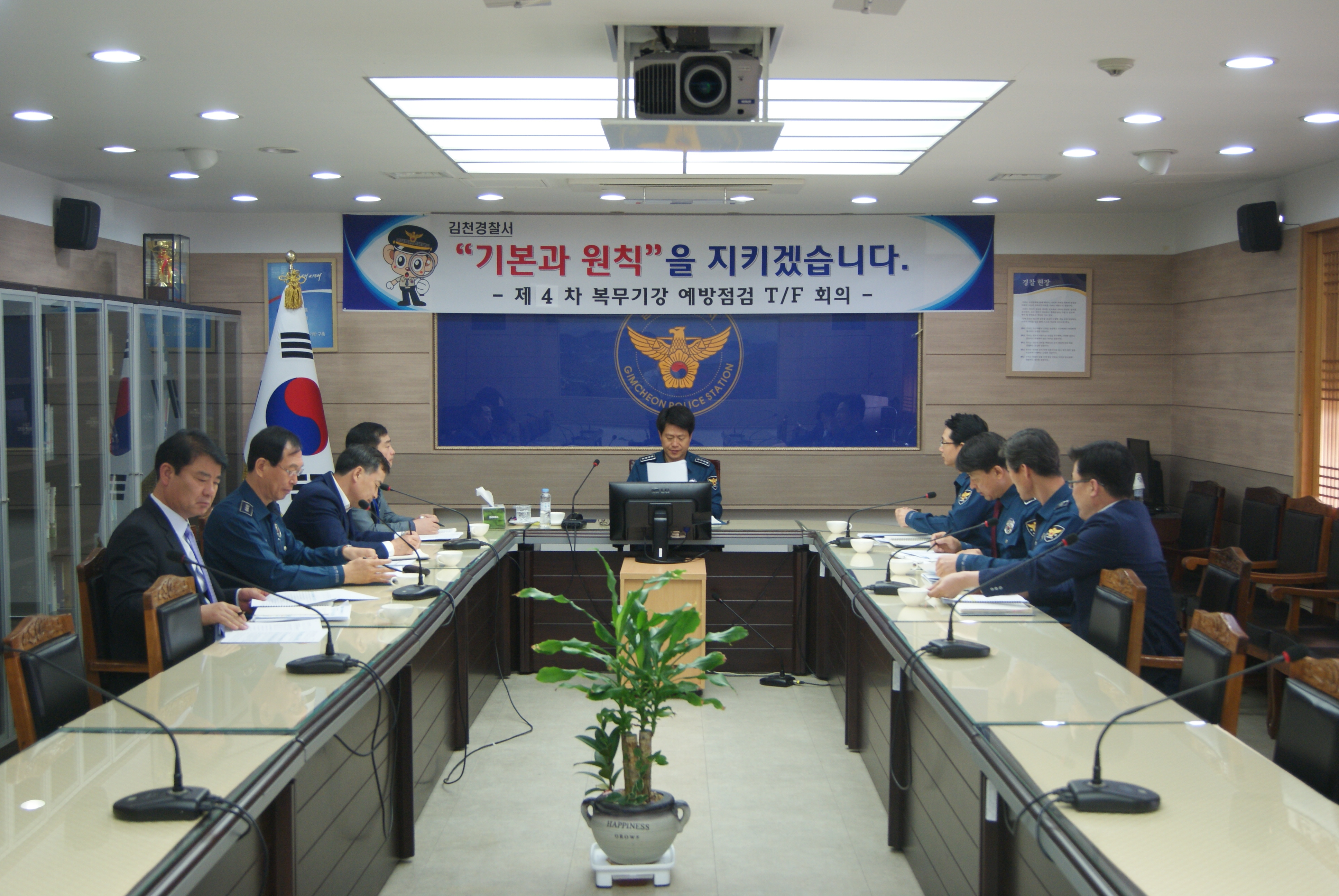 4월 28일(금) 09:00경 경찰서 2층 소회의실에서 경찰서장 주재로 각 과장 등 9명이 참석한 가운데“제4차 복무기강 예방점검 T/F”회의를 개최하였다.