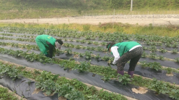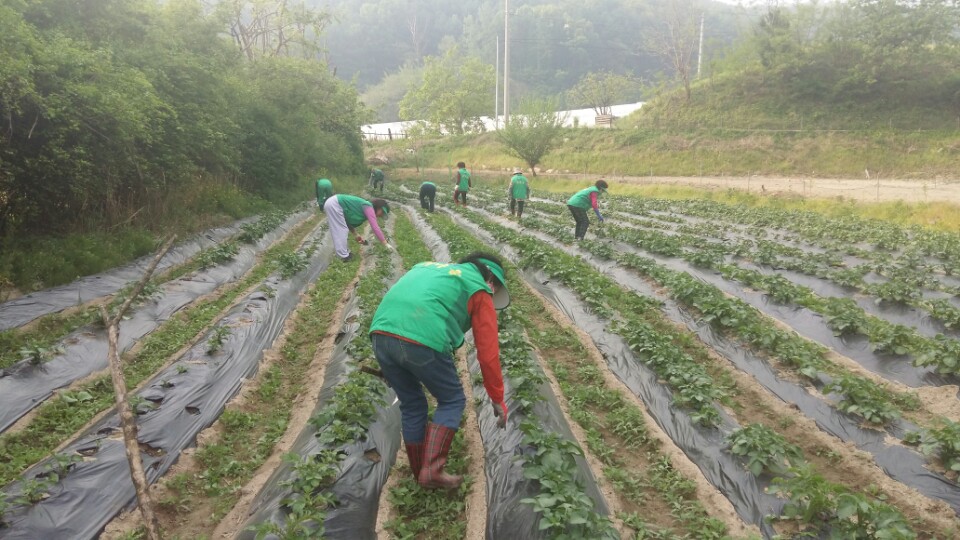 봉산면 새마을협의회 회원 40명은 5월3일 아침 일찍 지난달에 씨감자를 심어두었던 신암리 감자밭에 모여 잡초를 제거하고, 감자순을 정리하는데 구슬땀을 흘렸다.