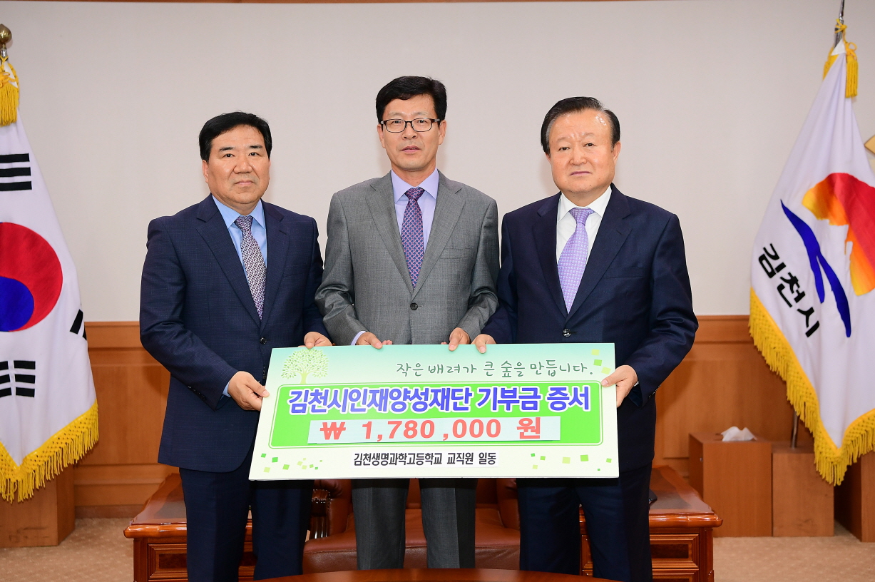 | 김천의 교육발전과 글로벌 인재육성을 위해 김천생명과학고등학교(교장 박성욱) 교직원 일동이 김천시인재양성재단(이사장 박보생)에 장학기금 일백칠십팔만원을 기탁했다.