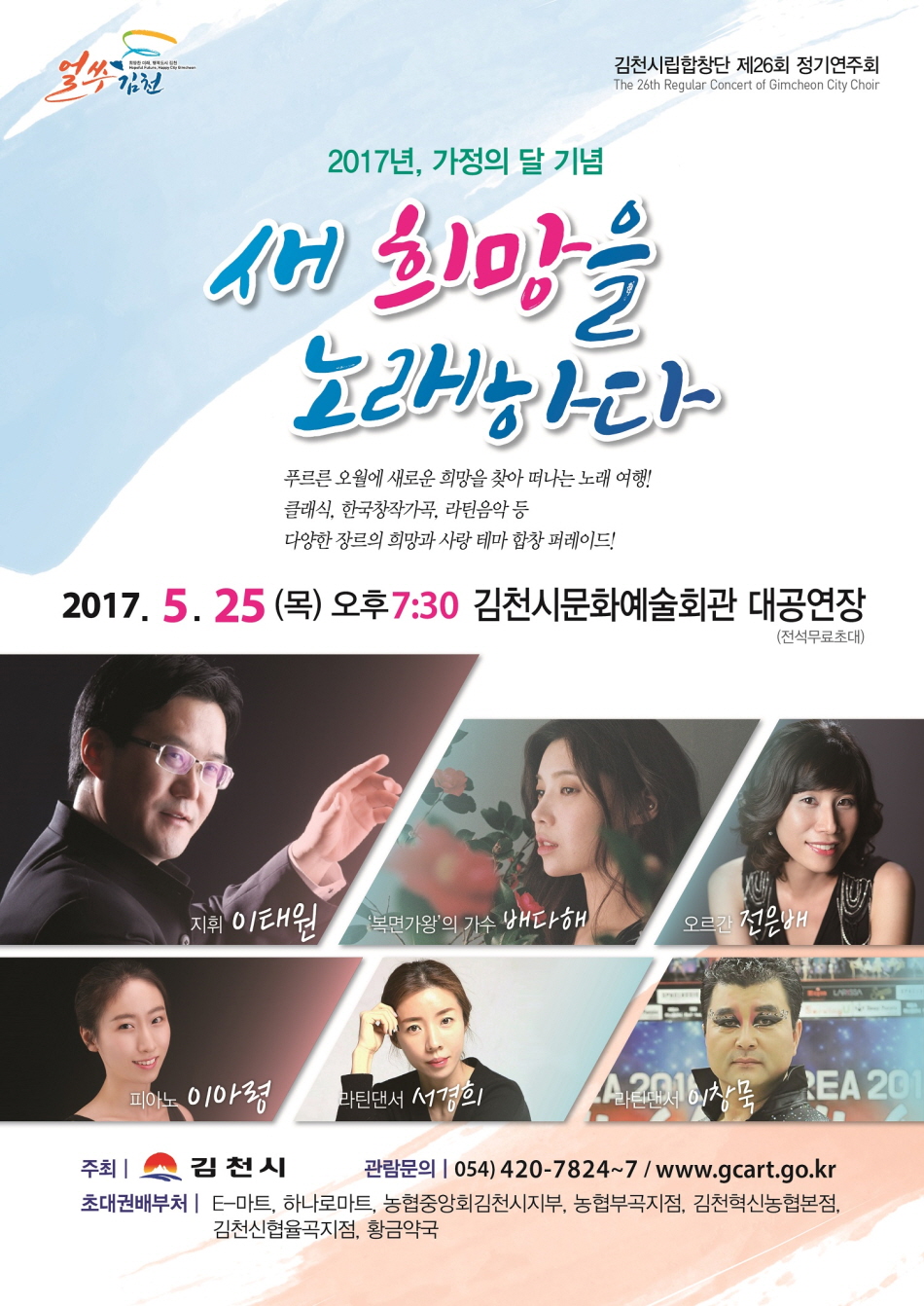 | 2017년 가정의 달 기념으로 열리는 이번 공연은 ‘새 희망을 노래하다’라는 부제아래 푸르른 오월에 새로운 희망과 사랑을 찾아 떠나는 노래여행으로 클래식, 한국창작가곡, 라틴음악 등 다양한 장르의 합창 퍼레이드로 펼쳐진다.