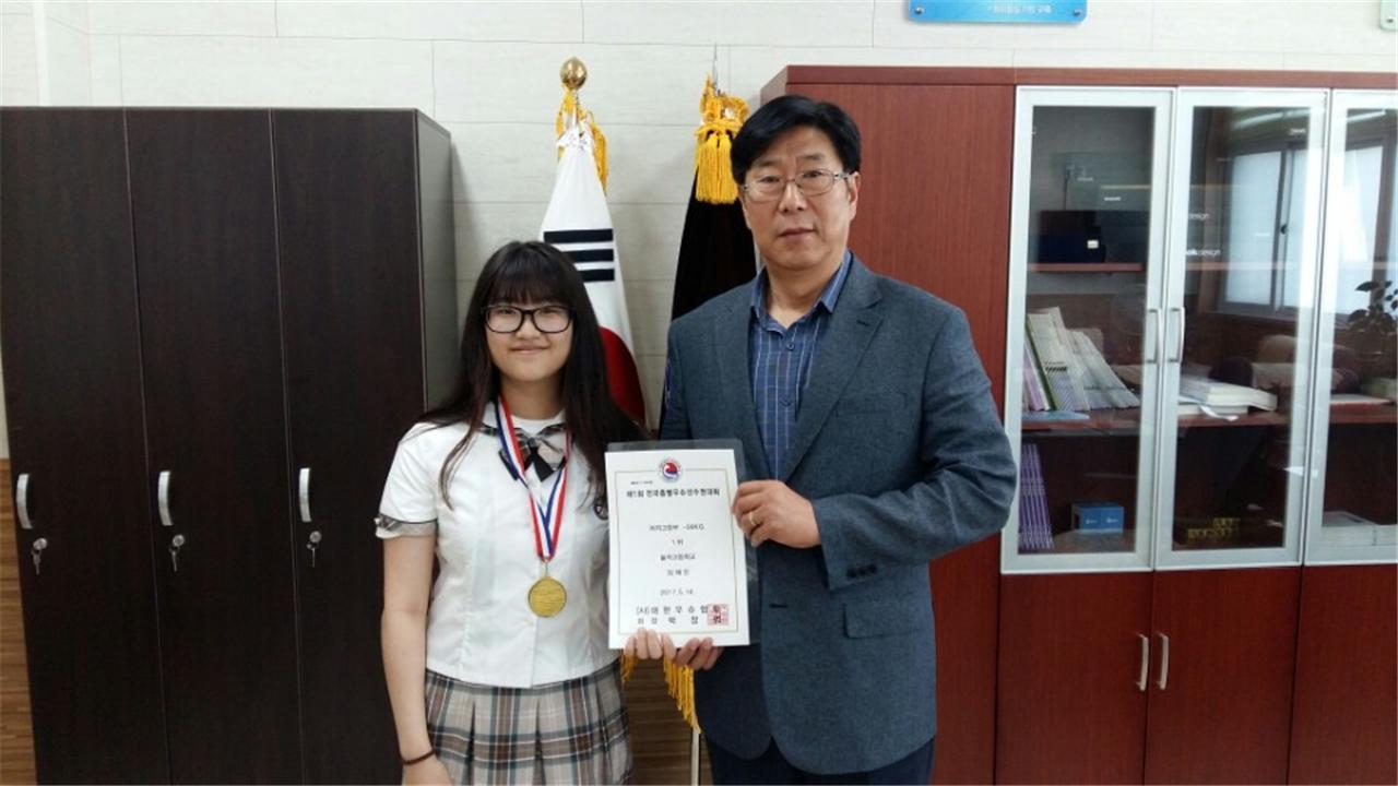 | 김혜진 학생 “대회 첫 출전인데 이렇게 큰 대회에서 우승을 하게 되어 매우 기쁘다. 믿고 대회 출전 및 격려해주신 교장선생님과 이태정 선생님께 감사드린다. 앞으로 학업과 병행하여 학교생활에서도 모범이 되며 운동 또한 즐기면서 열심히 하는 선수가 되겠다.”