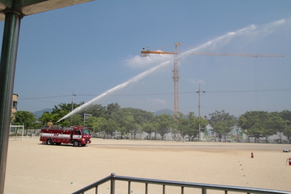 | 김천 다수 119안전센터 소방관들은 올바른 소화기 사용법에 대한 교육을 실시하였고 실제 현장처럼 소방차에서 살수하는 장면을 보여주었다.