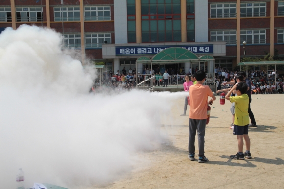 학생들은 화재경보가 울리자 코와 입을 막고 낮은 자세를 유지하며 지정된 대피경로를 통해 신속하게 학교 건물을 빠져나와 안전한 장소로 대피하였다. 또한 소방관과 함께 전교어린이 임원단이 분말소화기를 통해 실제 불을 진압하였다.