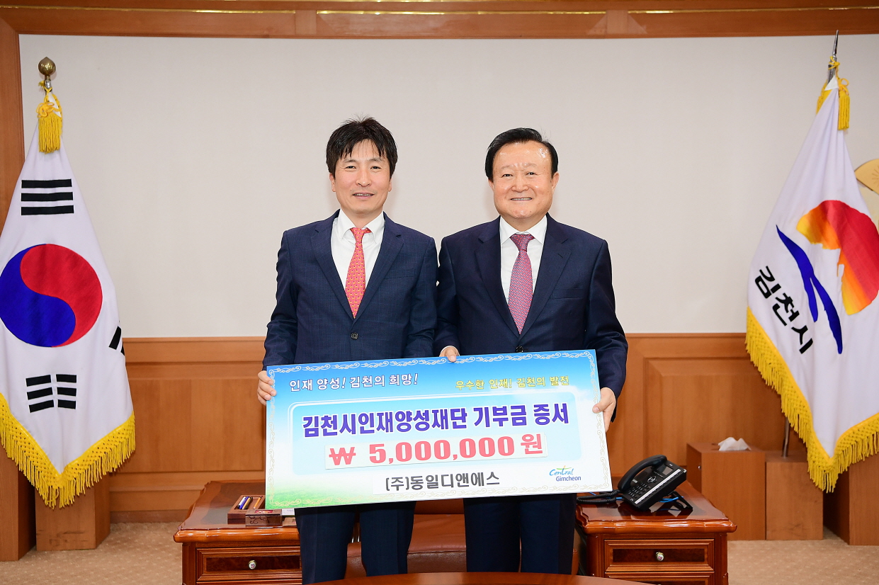 | 김천의 교육발전과 글로벌 인재육성을 위해 (주)동일디앤에스(대표이사 정재엽)에서 김천시인재양성재단(이사장 박보생)에 장학기금 오백만원을 기탁했다.