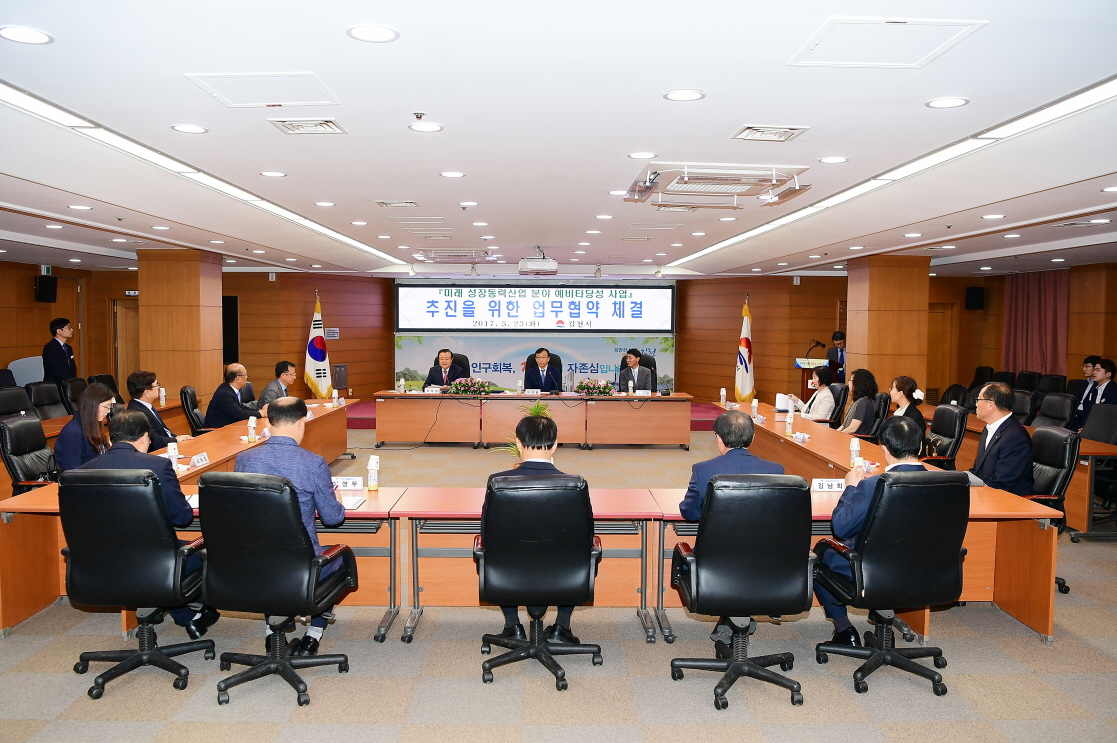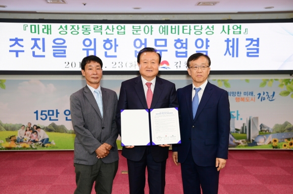 | 김천시(시장 박보생)는 지난 5월 23일 시청 2층 회의실에서 한국생산기술연구원, (재)연구소재중앙센터와 미래 성장동력산업 분야 예비타당성 사업 추진을 위한 업무협약을 체결하였다.