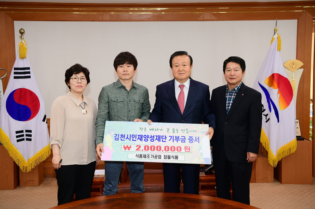 | 김천의 교육발전과 글로벌 인재육성을 위해 참들식품 영농조합법인(대표나정엽)에서 김천시인재양성재단(이사장 박보생)에 장학기금 이백만원을 기탁했다.