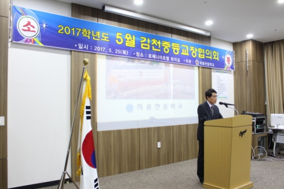 |  | | | ⓒ 김천내일신문 | | 「2017학년도 김천중등교장협의회」가 지난 5월 25일 지품천중 주관으로 로제니아 호텔 회의실에서 이현철 교감의 사회로 진행되었다.